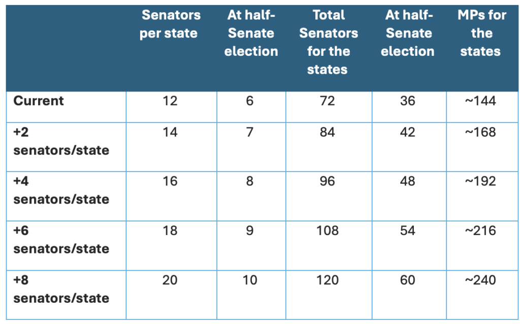 Table 1: Options for an increase in the size of Parliament (Note: Only half of all state senators are up for election at any given time – this figure is given in the third column)