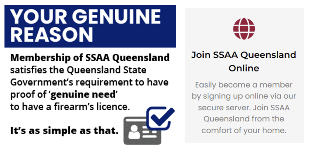 In fact, you can show genuine reason to have a gun “from the comfort of your home” just by joining the Queensland branch of the Sporting Shooters Association of Australia (SSAA). According to the SSAA, “It’s as simple as that”: