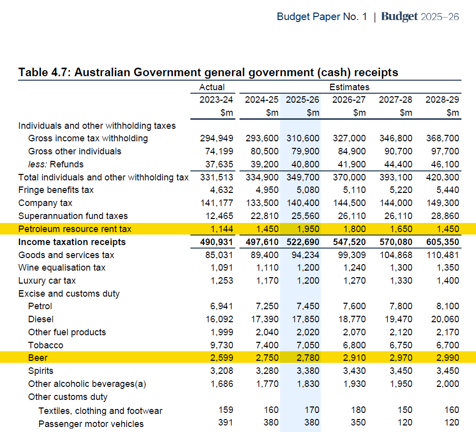 Government budget papers show that beer excise raises between $2.5 billion and $3 billion per year, while PRRT raises between $1 billion and $2 billion each year: