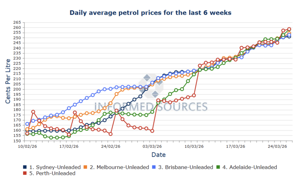 Up to yesterday petrol prices had risen on average around 32% across the nation – for an average of 61 cents/litre – since the Iran War began.