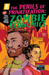 The comic traces the experience of a young Australian couple from the beginnings of privatisation in the 1980s to an optimistic version of the near future when this zombie idea has finally been laid to rest. They are initially receptive to the promise of private sector efficiency but soon learn that the only people who benefit are the financiers.