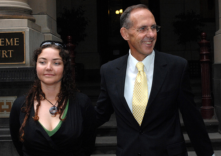 Photo: Greens senator Bob Brown and environmental activist Louise Morris (left) leave the Supreme Court in Melbourne, Tuesday, April 3, 2007. A Supreme Court judge today threw out an original statement of claim in a lawsuit taken out against 20 environmental groups or individuals, including two Green party politicians, citing their ongoing damaging campaigns and other activities against the company. (AAP Image/Julian Smith)