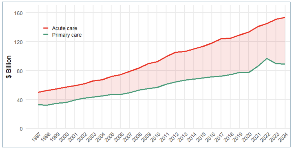 Constant prices. Acute care combines total expenditure (public and private) on hospitals, capital, and referred services. (L Slawomirski. Source: AIHW Health expenditure Australia 2023-24)
