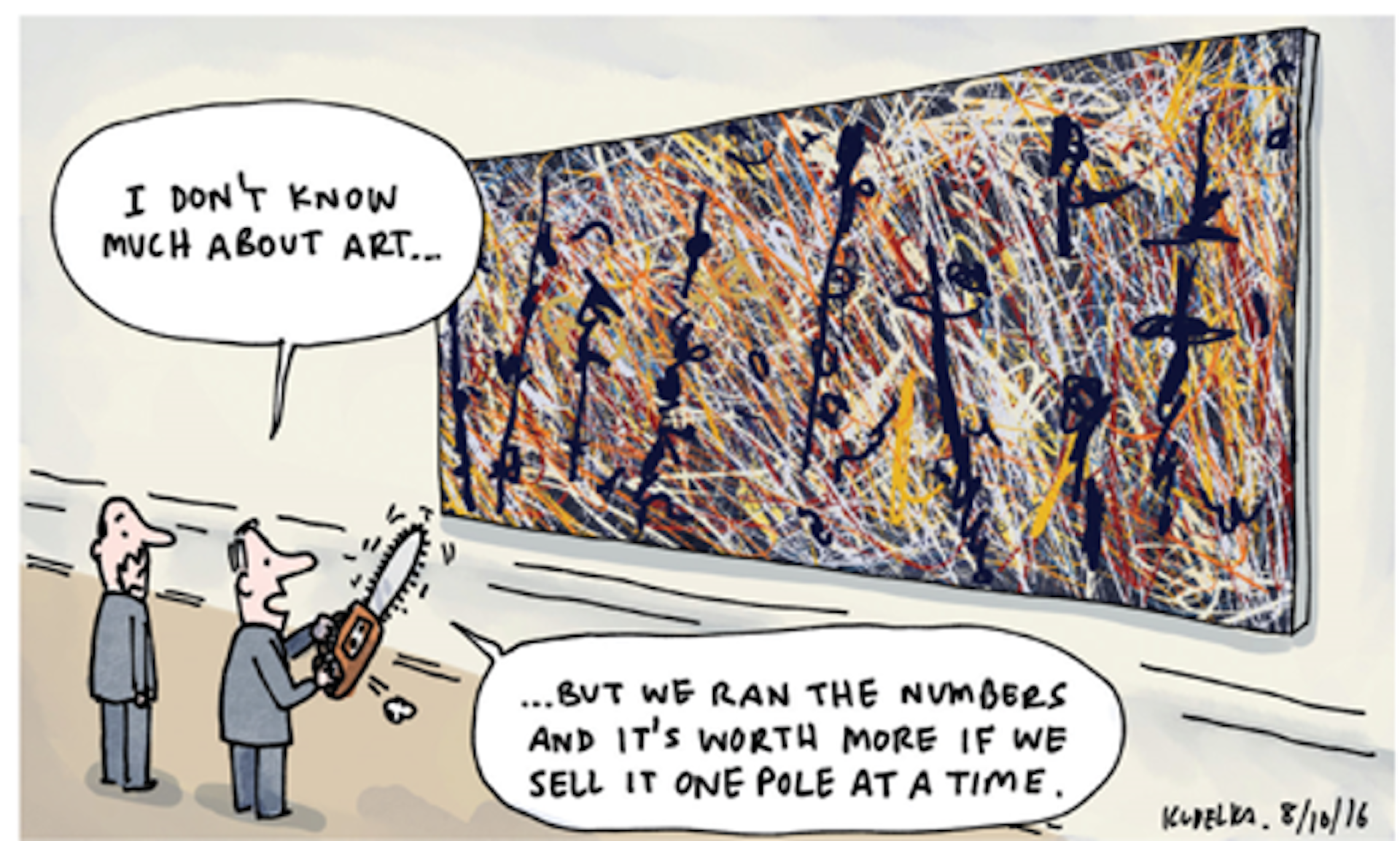 In 2016, Jackson Pollock’s Blue Poles, in the collection of the National Gallery of Australia, was valued at A$350 million. Coalition Senator James Paterson – either mischievously or out of proper philistinism – suggested we might now sell the painting and bank the profit.