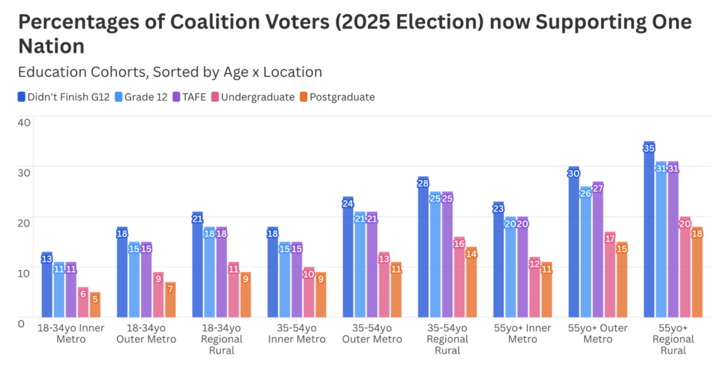 As of late last year (before the Bondi tragedy), around one in three previous Liberal/National voters living in rural or regional areas who didn’t finish high school, or who had a high school or TAFE education, said they would vote for One Nation. For those with a university education in the same area the number drops to one in five. At the other end of the spectrum, among Coalition voters aged 18-34 in inner metro areas, around one in 10 without a university education planned to vote for One Nation, compared to one in 20 with a degree.