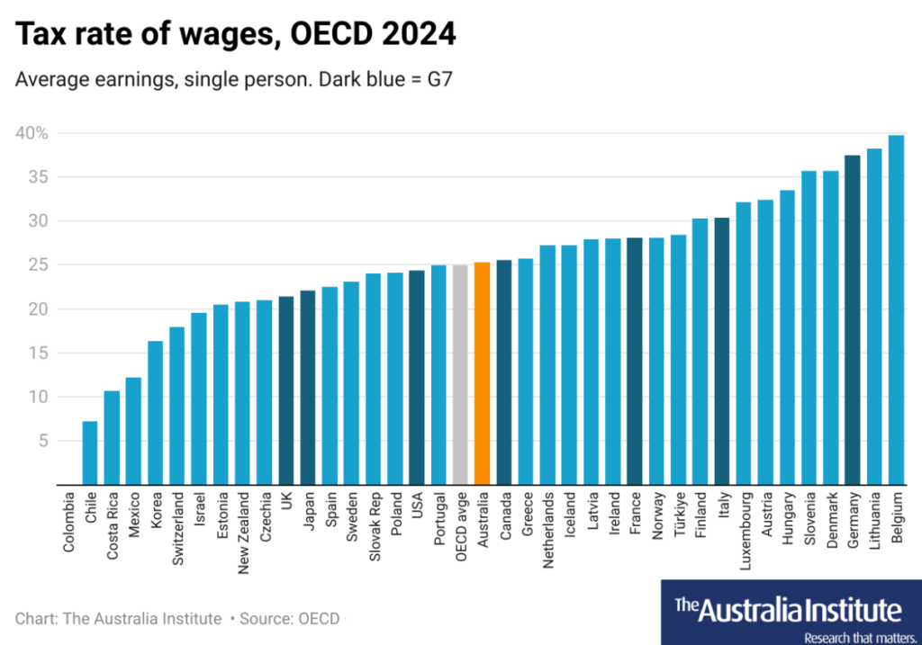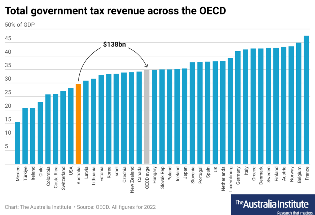 On the most recent figures, Australia has the ninth lowest level of tax among advanced economies in the OECD. In 2022, Australia’s tax revenue was worth 29.7% of GDP compared to the average across the OECD of 34.8% of GDP. That difference is equivalent to an extra $138bn more tax revenue.